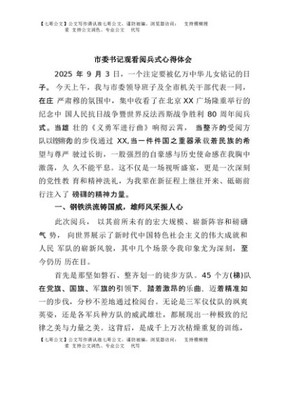 / 【七哥公文】2025年:市委书记观看阅兵式心得体会+更多免费公文+VX:QiGeGongWen2024