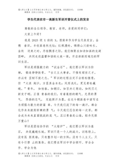 / 【七哥公文】2025年:学生代表在市一高新生军训开营仪式上的发言+更多免费公文+VX:QiGeGongWen2024