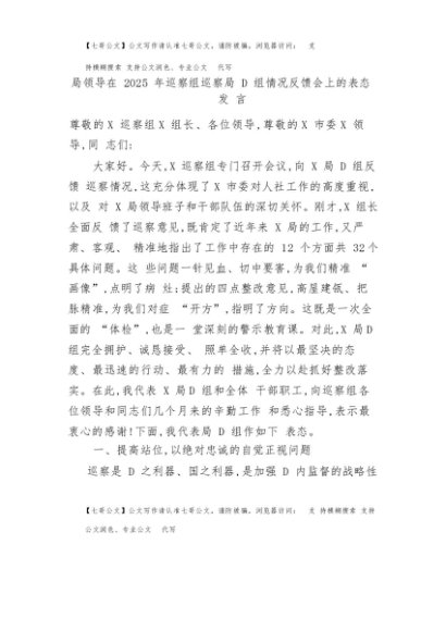 【七哥公文】2025年:局领导在2025年巡察组巡察局党组情况反馈会上的表态发言+更多免费公文+VX:QiGeGongWen2024