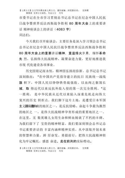 【七哥公文】2025年:市委书记在全市学习贯彻总书记总书记在纪念中国人民抗日战争暨世界反法西斯战争胜利80周年大会上的重要讲话精神座谈会上的讲话(4083字)+更多免费公文+VX:QiGeGongWen2024