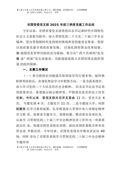 / 【七哥公文】2025年:市国资委党支部2025年前三季度党建工作总结+更多免费公文+VX:QiGeGongWen2024