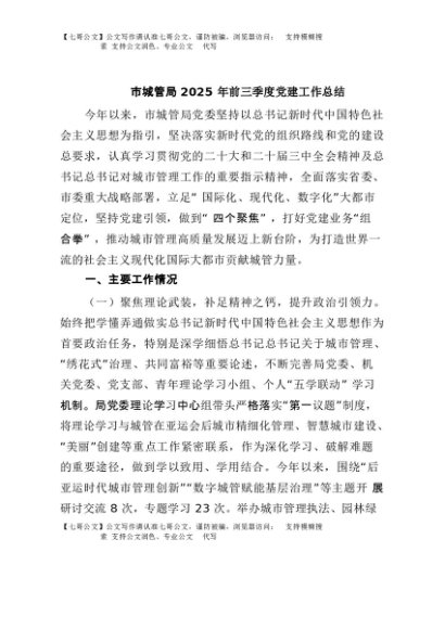 / 【七哥公文】2025年:市城管局2025年前三季度党建工作总结+更多免费公文+VX:QiGeGongWen2024