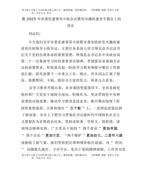 【七哥公文】2025年:市委党建领导小组会议暨党风廉政建设专题会上的讲话+更多免费公文+VX:QiGeGongWen2024