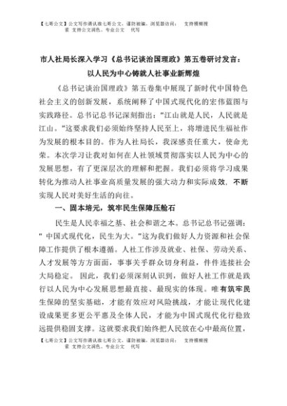 【七哥公文】2025年:市人社局长深入学习《总书记谈治国理政》第五卷研讨发言:以人民为中心铸就人社事业新辉煌+更多免费公文+VX:QiGeGongWen2024
