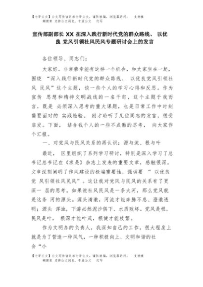 【七哥公文】2025年:宣传部副部长XX在深入践行新时代党的群众路线、以优良党风引领社风民风专题研讨会上的发言+更多免费公文+VX:QiGeGongWen2024