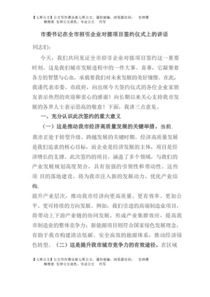 / 【七哥公文】2025年:市委书记在全市招引企业对接项目签约仪式上的讲话+更多免费公文+VX:QiGeGongWen2024