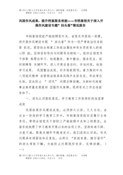 【七哥公文】2025年:巩固作风成果,提升档案服务效能——市档案馆关于深入开展作风建设专题“回头看”情况报告+更多免费公文+VX:QiGeGongWen2024