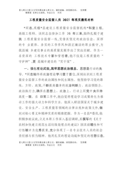 / 【七哥公文】2025年:工程质量安全监督人员2025年现实表现材料+更多免费公文+VX:QiGeGongWen2024