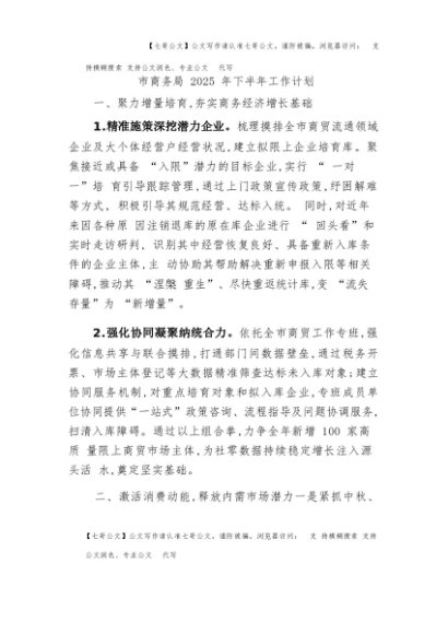 / 【七哥公文】2025年:市商务局2025年下半年工作计划+更多免费公文+VX:QiGeGongWen2024