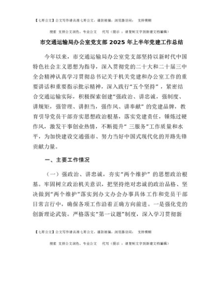 【七哥公文】2025年:市交通运输局办公室党支部2025年上半年党_建工作总结+更多免费公文+VX:QiGeGongWen2024