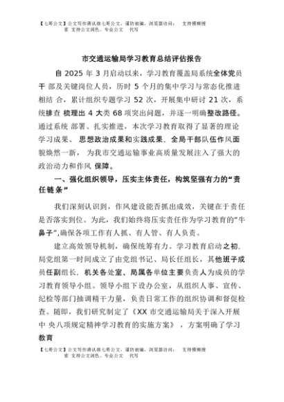 【七哥公文】2025年:市交通运输局学习教育总结评估报告+更多免费公文+VX:QiGeGongWen2024