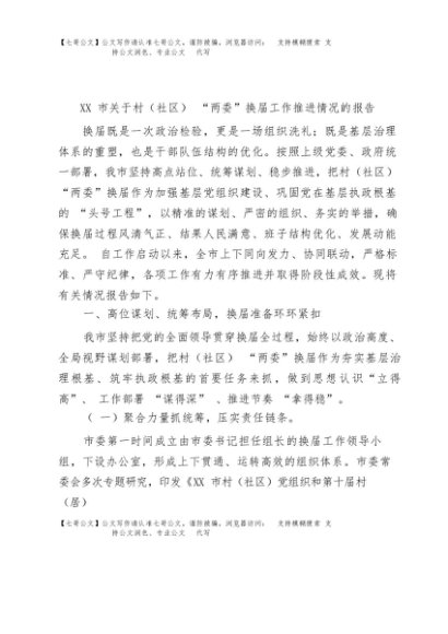 【七哥公文】2025年:市关于村(社区)“两委”换届工作推进情况总结报告+更多免费公文+VX:QiGeGongWen2024