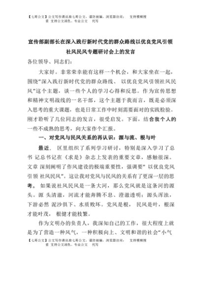 【七哥公文】2025年:宣传部副部长在深入践行新时代党的群众路线以优良党风引领社风民风专题研讨会上的发言+更多免费公文+VX:QiGeGongWen2024