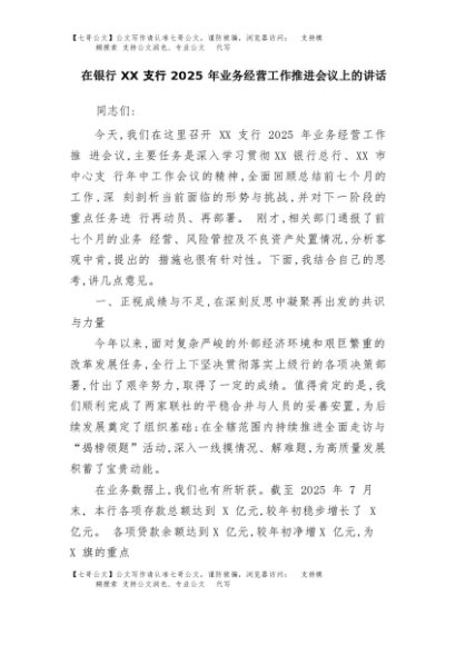 【七哥公文】2025年:在银行XX支行2025年业务经营工作推进会议上的讲话+更多免费公文+VX:QiGeGongWen2024