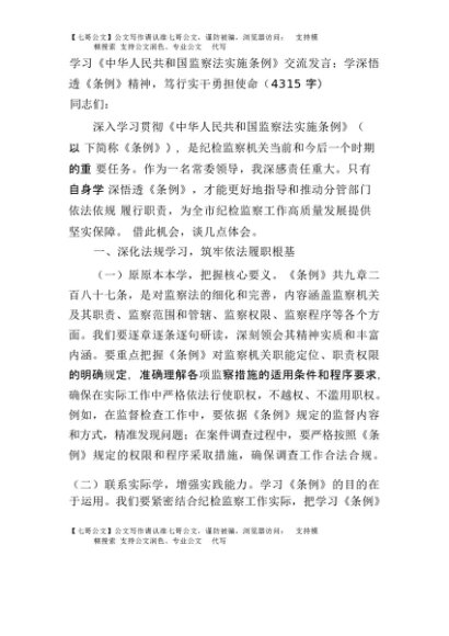 【七哥公文】2025年:学习《中华人民共和国监察法实施条例》交流发言:学深悟透《条例》精神,笃行实干勇担使命(4315字)+更多免费公文+VX:QiGeGongWen2024