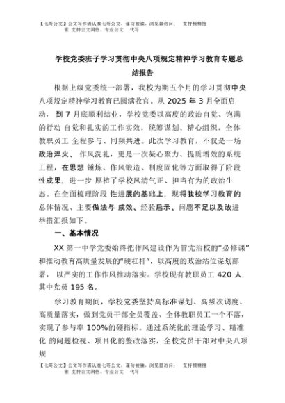 【七哥公文】2025年:学校党委班子学习贯彻中央八项规定精神学习教育专题总结报告+更多免费公文+VX:QiGeGongWen2024