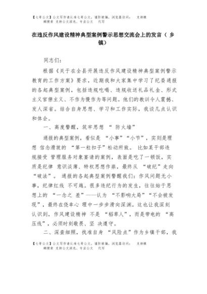 【七哥公文】2025年:在违反作风建设精神典型案例警示思想交流会上的发言(乡镇)+更多免费公文+VX:QiGeGongWen2024