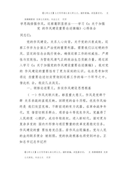 【七哥公文】2025年:学习《总书记关于加强党的作风建设重要论述摘编》心得发言:学思践悟强作风,巡察履职显担当+更多免费公文+VX:QiGeGongWen2024