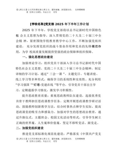 / 【七哥公文】2025年:学校党支部-2025年下半年工作计划+更多免费公文+VX:QiGeGongWen2024