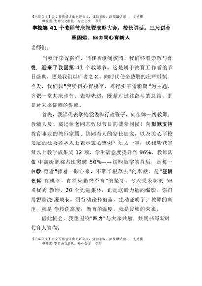 【七哥公文】2025年:学校第41个教师节庆祝暨表彰大会,校长讲话:三尺讲台系国运,四力同心育新人+更多免费公文+VX:QiGeGongWen2024