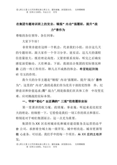 【七哥公文】2025年:在集团专题培训班上的发言:锤炼“内功”强履职,提升“战力”善作为+更多免费公文+VX:QiGeGongWen2024