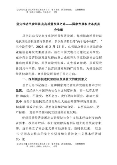 【七哥公文】2025年:坚定推动民营经济走高质量发展之路——国家发展和改革委员会党组+更多免费公文+VX:QiGeGongWen2024