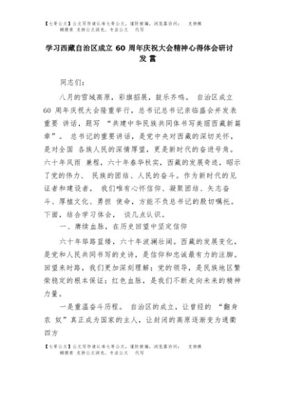 【七哥公文】2025年:学习西藏自治区成立60周年庆祝大会精神心得体会研讨发言+更多免费公文+VX:QiGeGongWen2024
