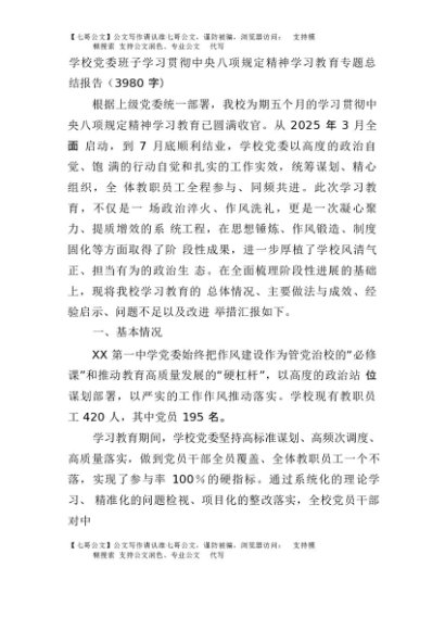 【七哥公文】2025年:学校党委班子学习贯彻中央八项规定精神学习教育专题总结报告(3980字)+更多免费公文+VX:QiGeGongWen2024