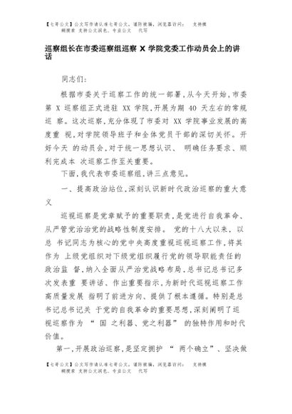 【七哥公文】2025年:巡察组长在市委巡察组巡察X学院党委工作动员会上的讲话+更多免费公文+VX:QiGeGongWen2024