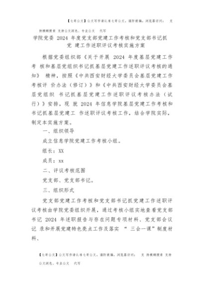 【七哥公文】2025年:学校党支部党建工作考核和党支部书记抓党建工作述职评议考核实施方案+更多免费公文+VX:QiGeGongWen2024
