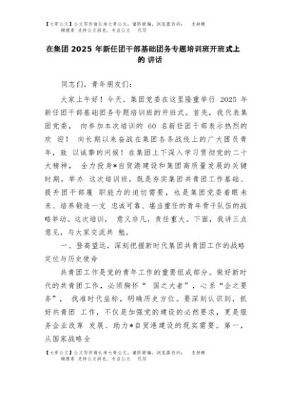 【七哥公文】2025年:在集团2025年新任团干部基础团务专题培训班开班式上的讲话+更多免费公文+VX:QiGeGongWen2024