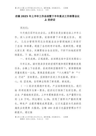 【七哥公文】2025年:在镇2025年上半年工作总结暨下半年重点工作部署会议上的讲话+更多免费公文+VX:QiGeGongWen2024