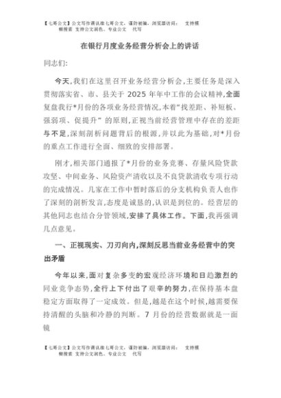 / 【七哥公文】2025年:在银行月度业务经营分析会上的讲话+更多免费公文+VX:QiGeGongWen2024