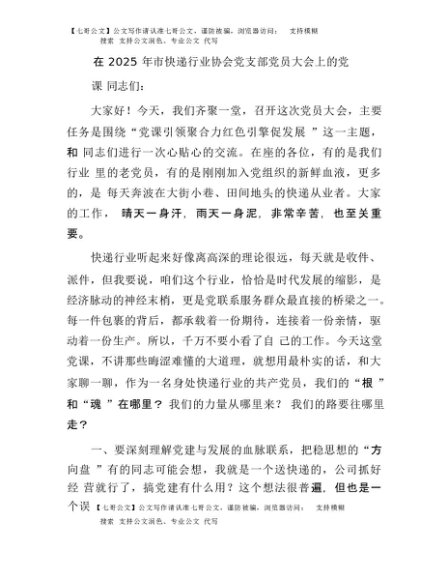 / 【七哥公文】2025年:在市快递行业协会党支部党员大会上的党课+更多免费公文+VX:QiGeGongWen2024