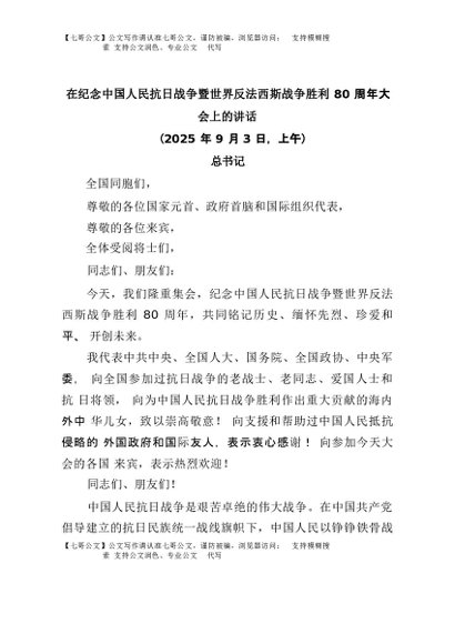 【七哥公文】2025年:在纪念中国人民抗日战争暨世界反法西斯战争胜利80周年大会上的讲话-总书记+更多免费公文+VX:QiGeGongWen2024