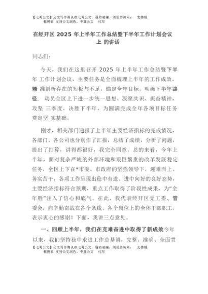 【七哥公文】2025年:在经开区2025年上半年工作总结暨下半年工作计划会议上的讲话+更多免费公文+VX:QiGeGongWen2024