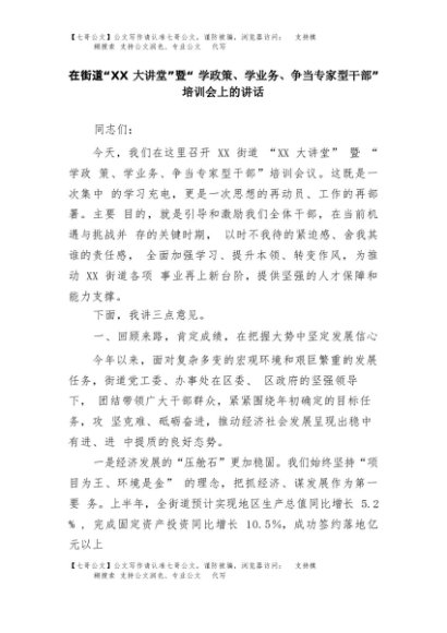 【七哥公文】2025年:在街道“XX大讲堂”暨“学政策、学业务、争当专家型干部”培训会上的讲话+更多免费公文+VX:QiGeGongWen2024