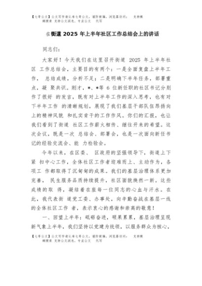 / 【七哥公文】2025年:在街道2025年上半年社区工作总结会上的讲话+更多免费公文+VX:QiGeGongWen2024