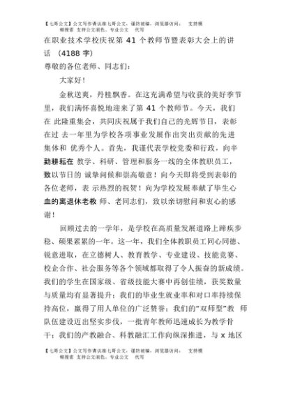 【七哥公文】2025年:在职业技术学校庆祝第41个教师节暨表彰大会上的讲话(4188字)+更多免费公文+VX:QiGeGongWen2024