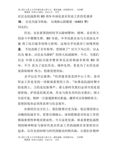 【七哥公文】2025年:在纪念抗战胜利80周年中深化意识形态工作的党课讲稿:以史为鉴守阵地、以魂铸心固根基(6483字)+更多免费公文+VX:QiGeGongWen2024