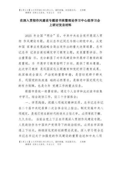 【七哥公文】2025年:在深入贯彻作风建设专题读书班暨理论学习中心组学习会上研讨发言材料+更多免费公文+VX:QiGeGongWen2024