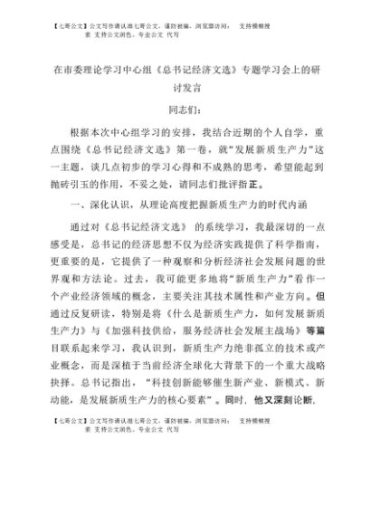 【七哥公文】2025年:在市委理论学习中心组《总书记经济文选》专题学习会上的研讨发言+更多免费公文+VX:QiGeGongWen2024