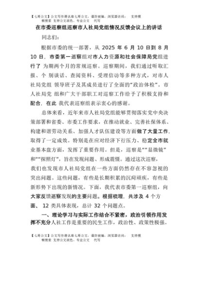 【七哥公文】2025年:在市委巡察组巡察市人社局党组情况反馈会议上的讲话+更多免费公文+VX:QiGeGongWen2024