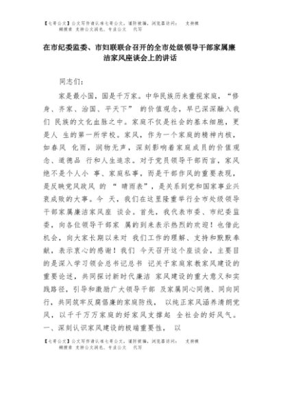 【七哥公文】2025年:在市纪委监委、市妇联联合召开的全市处级领导干部家属廉洁家风座谈会上的讲话+更多免费公文+VX:QiGeGongWen2024