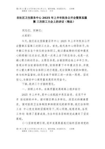 【七哥公文】2025年:在社区卫生服务中心2025年上半年院务公开会暨第五届第三次职工大会上的讲话(精品)+更多免费公文+VX:QiGeGongWen2024