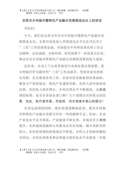 【七哥公文】2025年:在某市乡村振兴暨特色产业融合发展推进会议上的讲话+更多免费公文+VX:QiGeGongWen2024