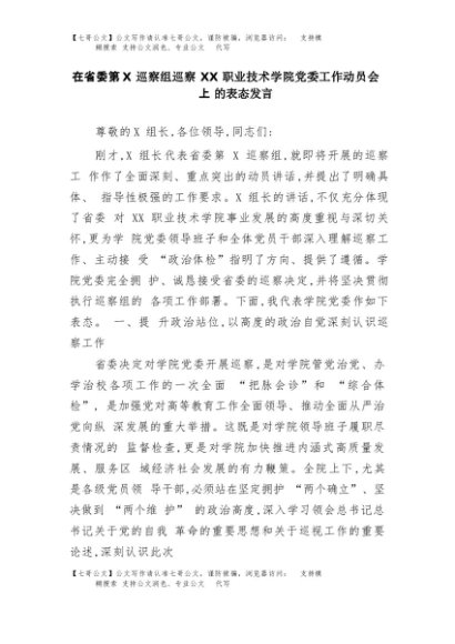 【七哥公文】2025年:在省委第X巡察组巡察XX职业技术学院党委工作动员会上的表态发言+更多免费公文+VX:QiGeGongWen2024