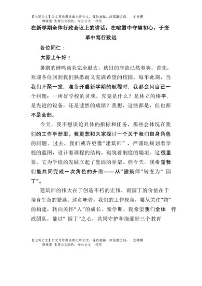 【七哥公文】2025年:在新学期全体行政会议上的讲话:在喧嚣中守望初心,于变革中笃行致远+更多免费公文+VX:QiGeGongWen2024