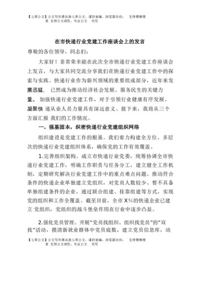 / 【七哥公文】2025年:在市快递行业党建工作座谈会上的发言+更多免费公文+VX:QiGeGongWen2024