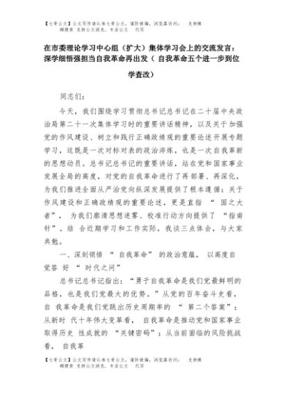 【七哥公文】2025年:在市委理论学习中心组(扩大)集体学习会上的交流发言:深学细悟强担当自我革命再出发(自我革命 五个进一步到位 学查改)+更多免费公文+VX:QiGeGongWen2024